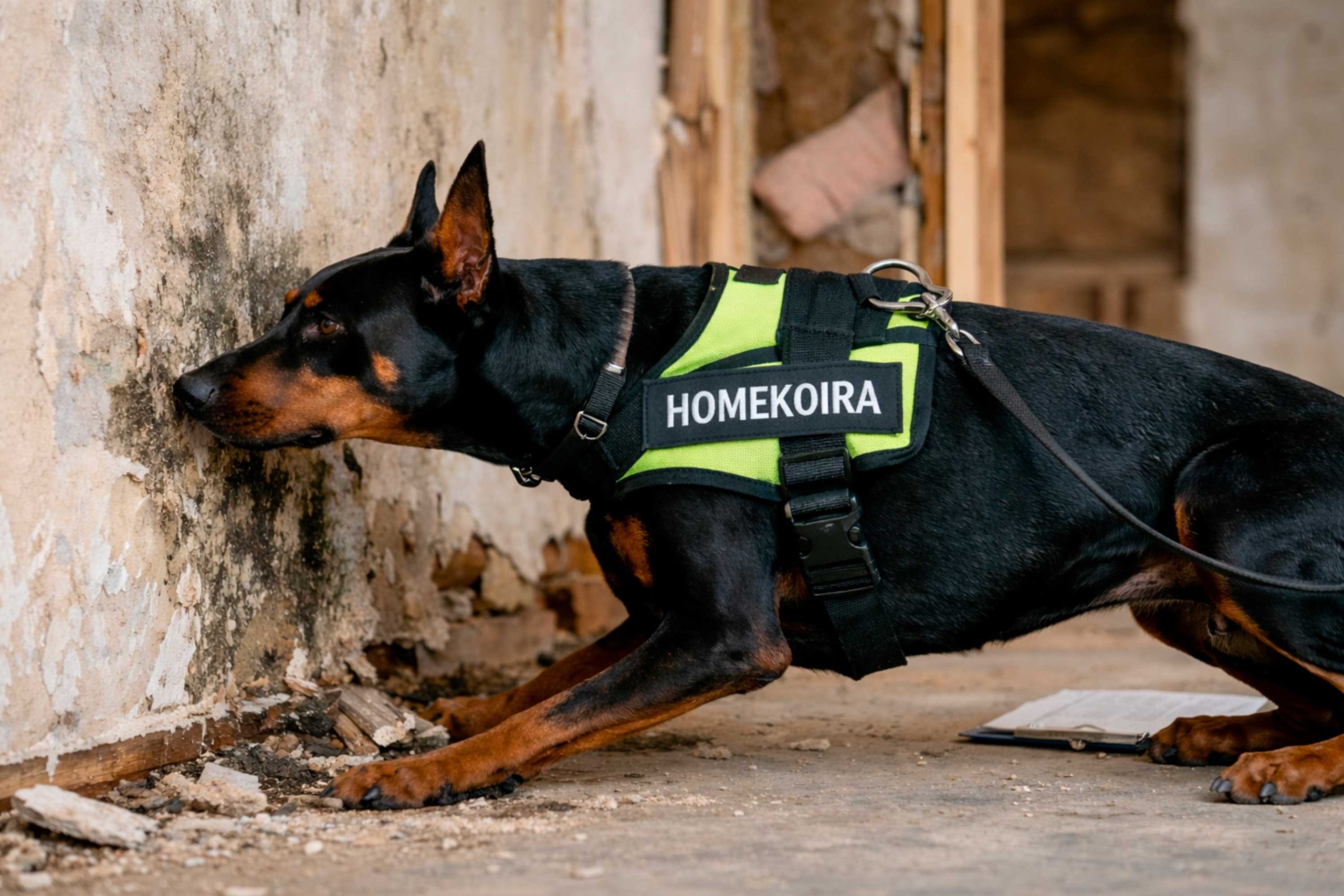 Erityisen koulutuksen saanut homekoira tarkastaa rakennuksen haistelemalla. Homekoiraa kykenee löytämään mahdolliset ongelmakohdat hyvinkin tarkasti vainunsa avulla. Koira merkitsee mahdolliset ongelmapaikat jähmettymällä.